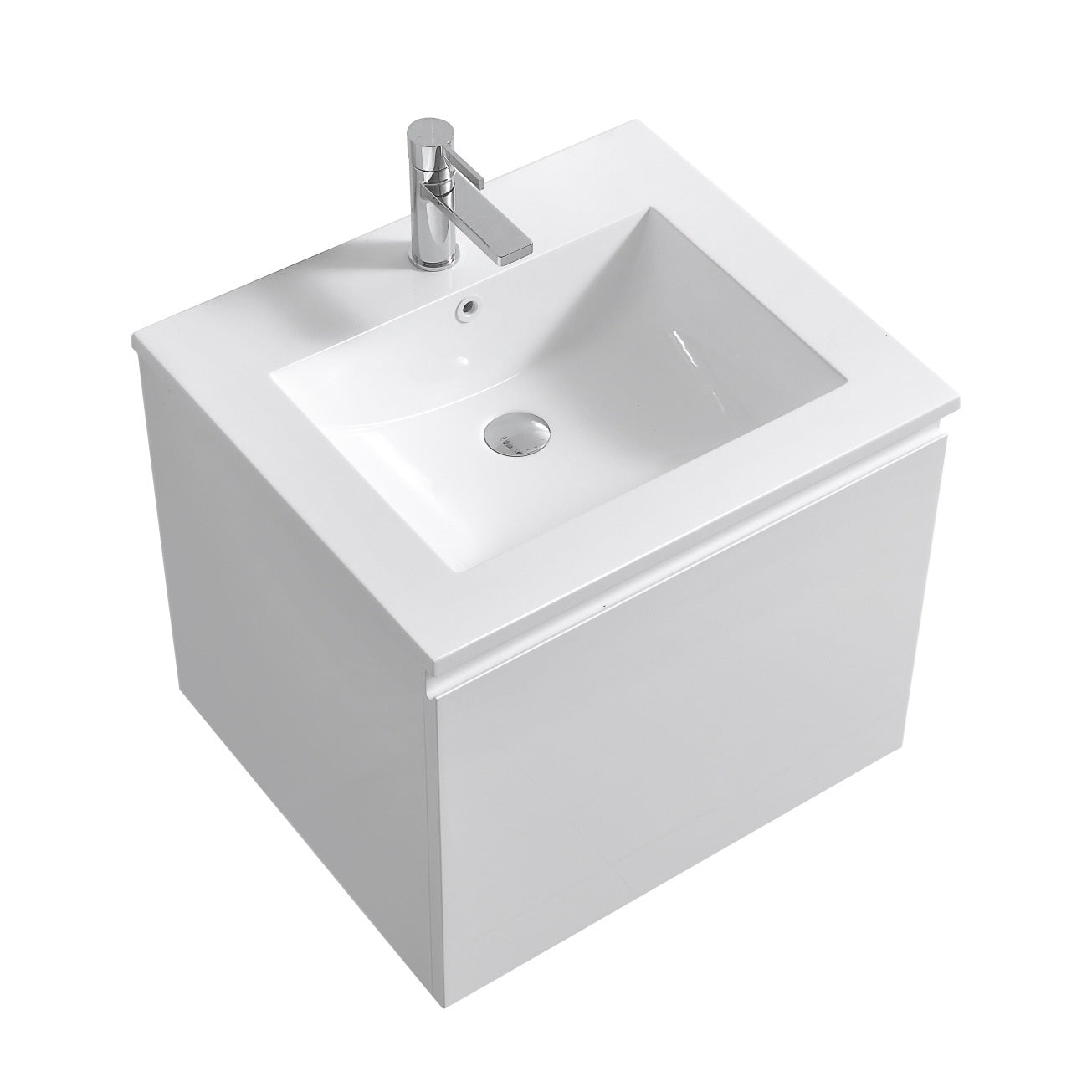 This Floating Wall-Mounted bathroom vanity features the large cupboard with one spacious drawer and one inner drawer for storing bathroom essentials. The clean, contemporary lines are enhanced by a crisp white integrated sink. Available in Gloss White, White Oak and Teal Green Finishes.
