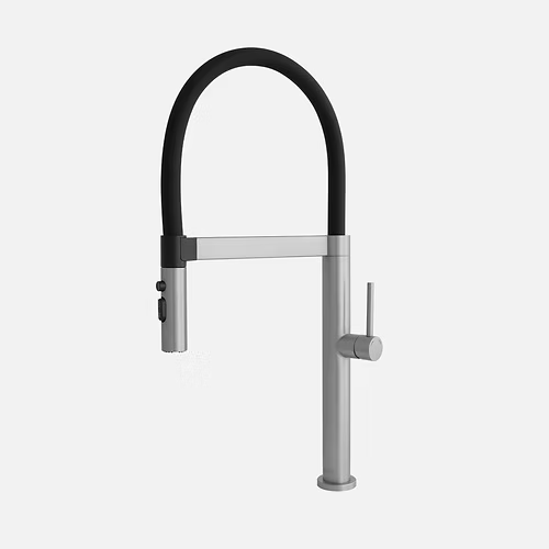 This sleek, modern, and easy-to-use pull-out kitchen faucet features smooth magnetic docking and three versatile spray modes: shower, stream, and blade. The smart, front-facing metal handle offers precise, intuitive control without interfering with the backsplash. Available in matte black, brushed gold, and stainless steel with black, red, or white silicone accents.