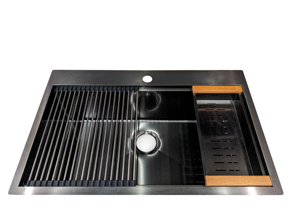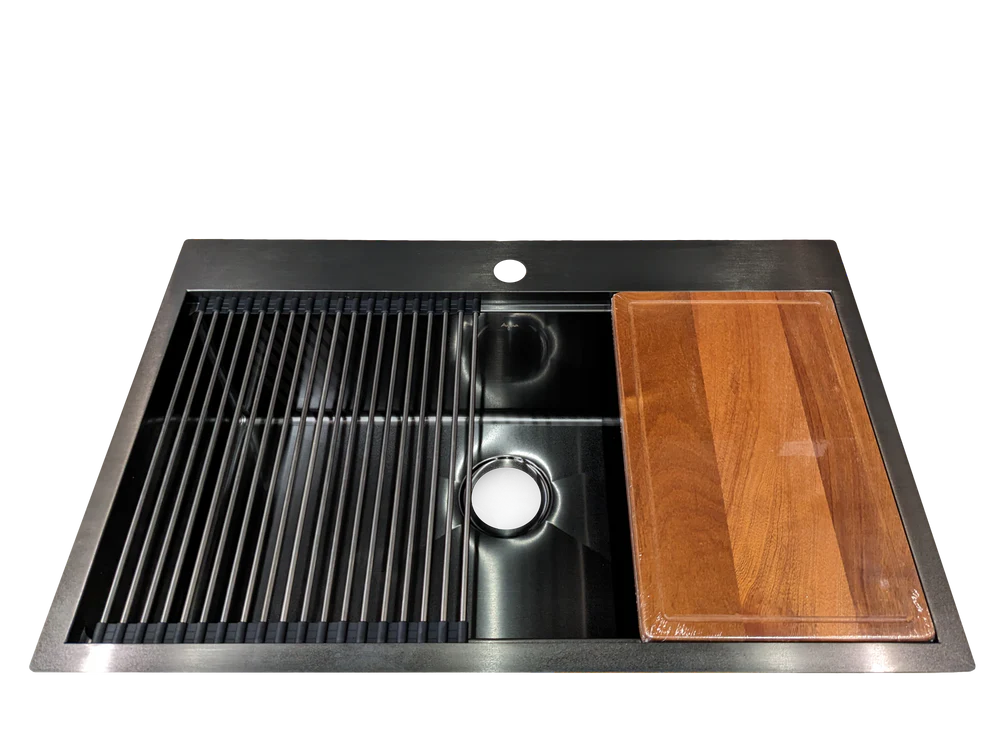 - Included in box: Basket strainer of 3-5/8’’, a drainer, roll-up dish drying rack, cutting board, fasteners and cutting template