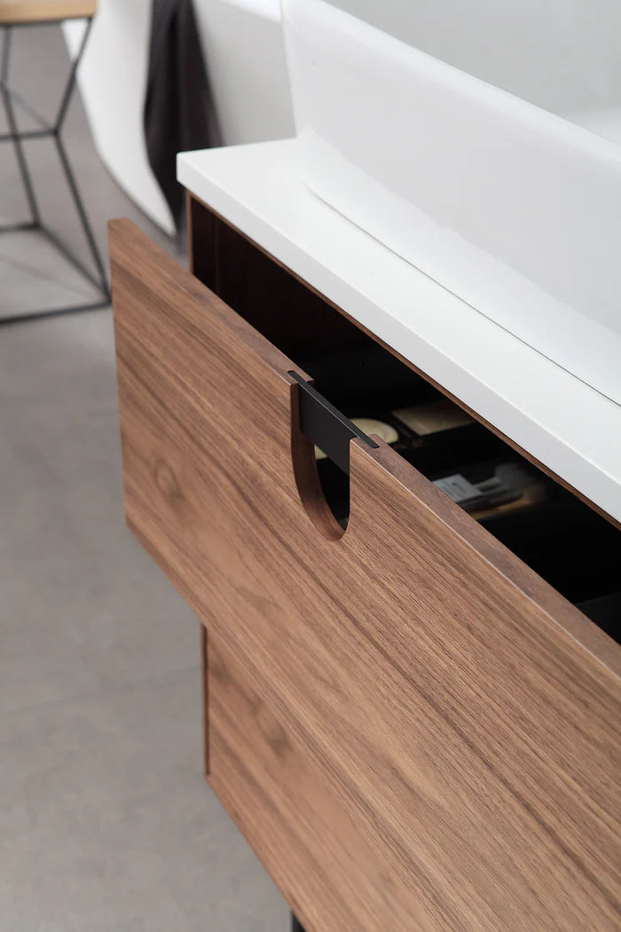 This small storage unit with solid oak wood fronts is ideal for adding a touch of natural chic to your bathroom. Equipped with two drawers and a white quartz countertop, this unit will provide you with a new designer storage space.