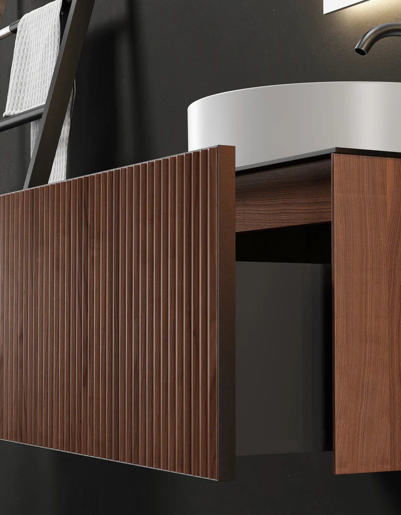 The INGRID hanging vanity brings modern style to a bathroom or powder room with its organic aesthetic and the clean lines of natural corrugated wood.