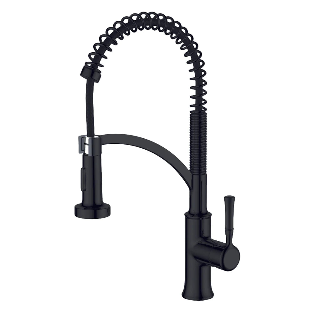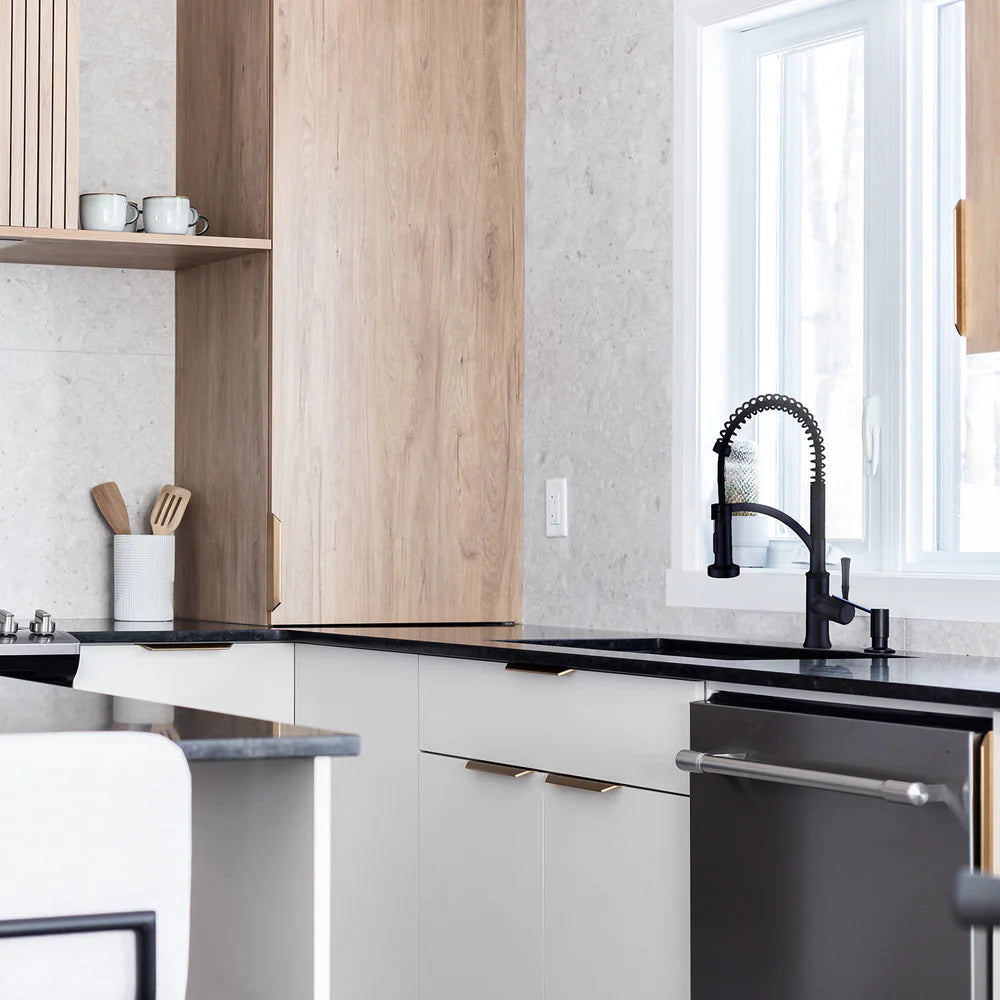 Sleek and fashionable, the matte black MAGICO pull-down kitchen faucet will instantly give your sink a high-class look. It is equipped with a single side handle that controls both water temperature and flow. Its solid brass construction and ceramic cartridge ensure the products durability. With its stylish two-tone finish, this ultra-trendy faucet will be the source of multiple compliments!