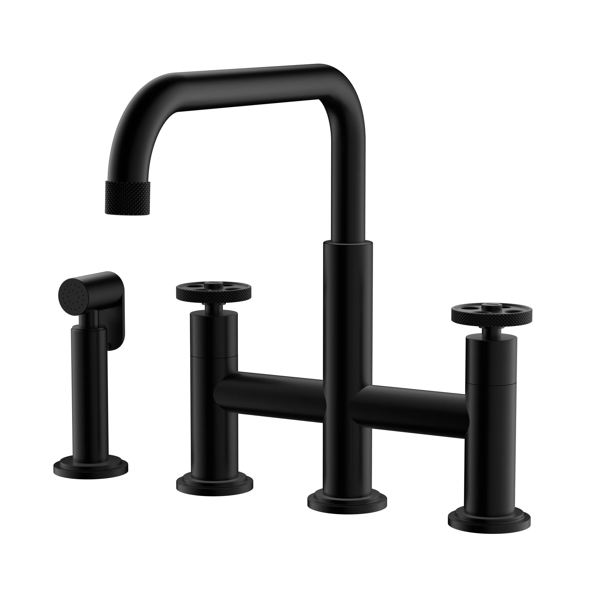 Our MONTI kitchen faucet reinvents the classic bridge faucet configuration with industrial design elements for a glamour modern look. Because of its added architectural elements and detailing, the premium finish will pop against your surrounding kitchen decor. Allow the brass construction, side sprayer, and swivel abilities to provide a sturdy and reliant fixture, great for use with any sink.