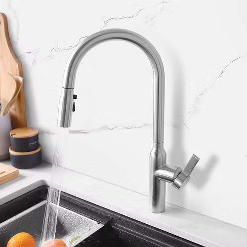 This beautiful and modern kitchen faucet comes in two finishes, brushed stainless steel and matte black, choose the finish that best matches your kitchen decor.