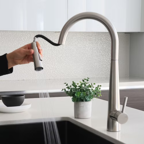 This faucet is made of 100% stainless steel and has been manufactured with top-quality components in order to ensure superior performance and durability. With a streamlined design and flexible functionality, this pull-down faucet is the perfect fit for your kitchen. The sleek lines and soft curves create a beautifully balanced silhouette that suits a range of styles, from classic to contemporary. This versatile faucet features an ergonomic pull-down metal spray head with magnetic retraction system and a single-lever handle for effortless flow control. The dual-function sprayer with flexible and swivel hose switches between aerated stream and powerful spray mode. To ensure long durability and reliable drip-free use, K135-Siena faucet comes with European ceramic cartridge, including a high-performance water-efficient aerator. This beautiful and elegant pull down kitchen faucet will bring a touch of minimalist style to your kitchen.