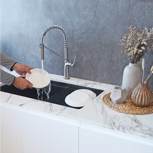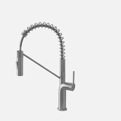This faucet is made of 100% stainless steel and has been manufactured with top-quality components to ensure superior performance and durability. The pull-down, dual-action metal spray head on the single-handle kitchen faucet allows for your choice of aerated flow or powerful spray for all your kitchen needs. The 360° swivel spout extends up to 25", and its spiral details make it a highly functional and beautiful statement piece. This kitchen faucet is made of all solid stainless steel material and with high quality components ensuring lasting value and superior performance. One of the high-performance components is an ultra-durable Kerox ceramic cartridge which has been tested for over 500,000 cycles. Also, includes a Neoperl aerator that reduces the waste of water without sacrificing pressure. This commercial style kitchen faucet fits a standard 35mm hole. Easy to install with a single hole countertop design. Included with the pull-down kitchen faucet are the stainless steel braided cold and hot water hoses and installation instructions. Make a bold statement and let your kitchen be the centre of attention when you install this commercial spring kitchen faucet, it will match any decorating style.